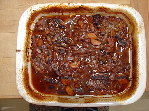 This was added to the dish, along with some tomato sauce and more red wine (you want to cover the ribs). He covered the dish with foil, put it into a 300 degree oven and went to bed.